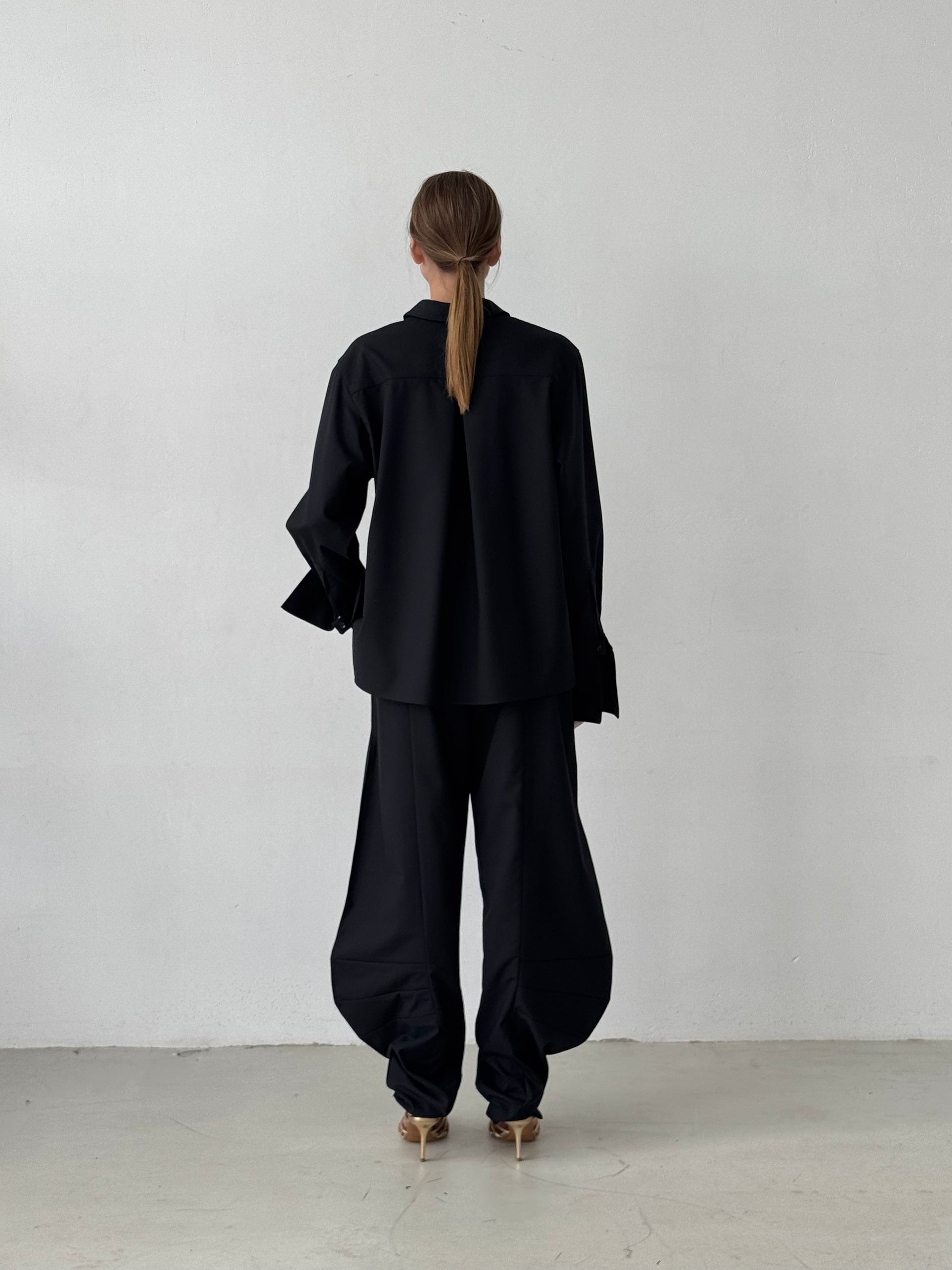 Basic shirt with handmade steaching around the collar and cuffs, large cuffs, hidden buttons, and a collar around the neck, with handmade stitches all around the collar. It also has a inverted pleat on the back.