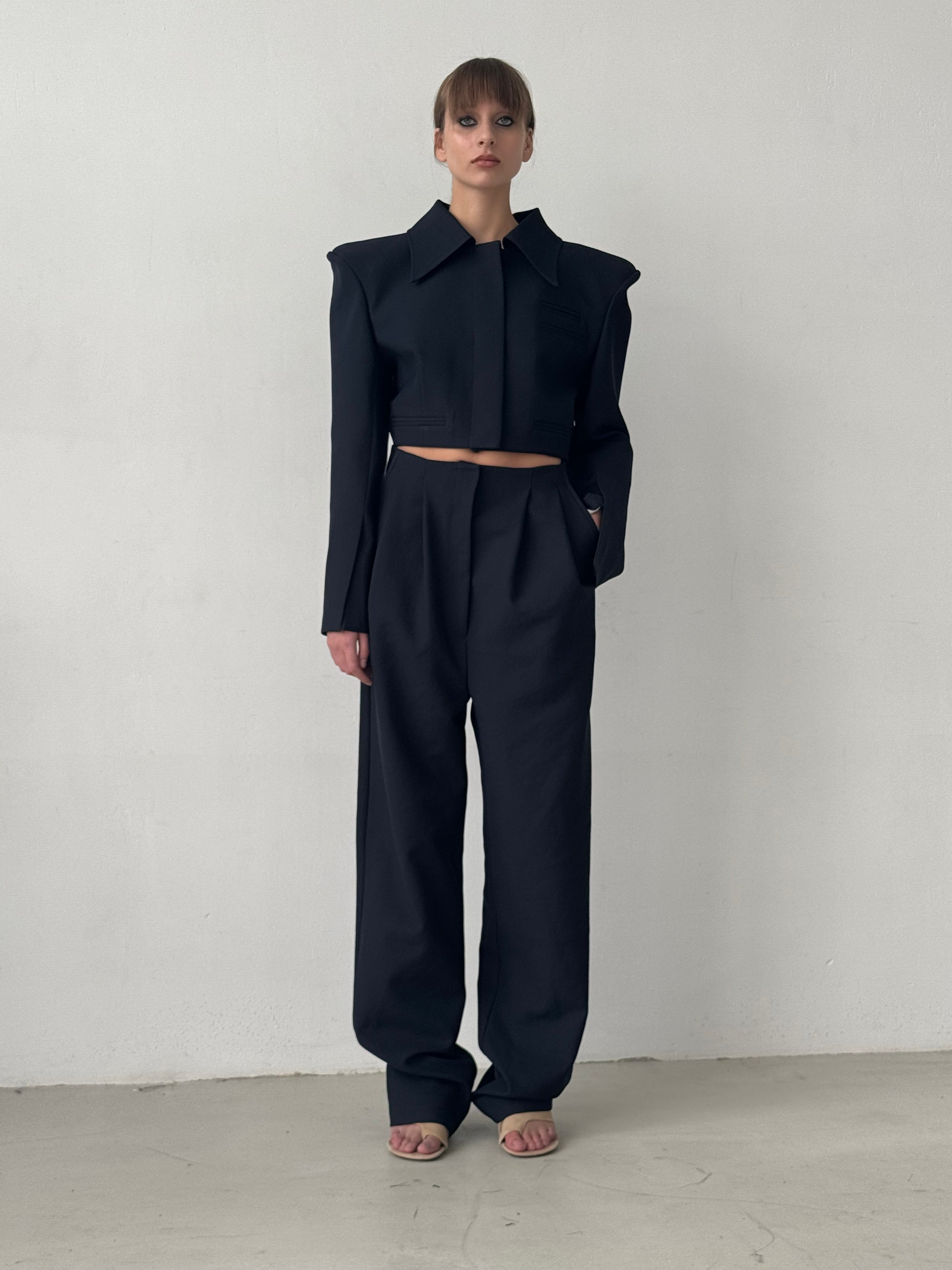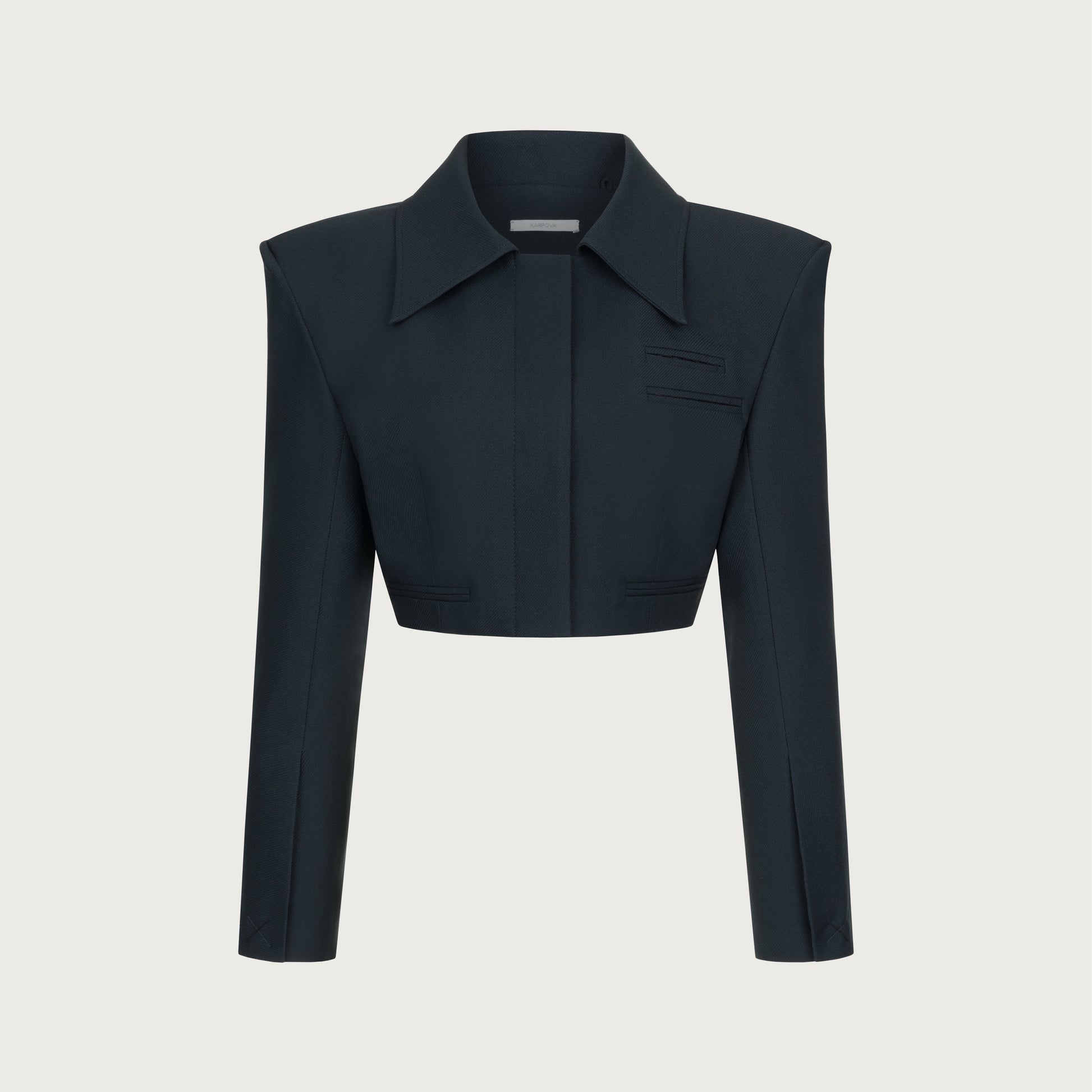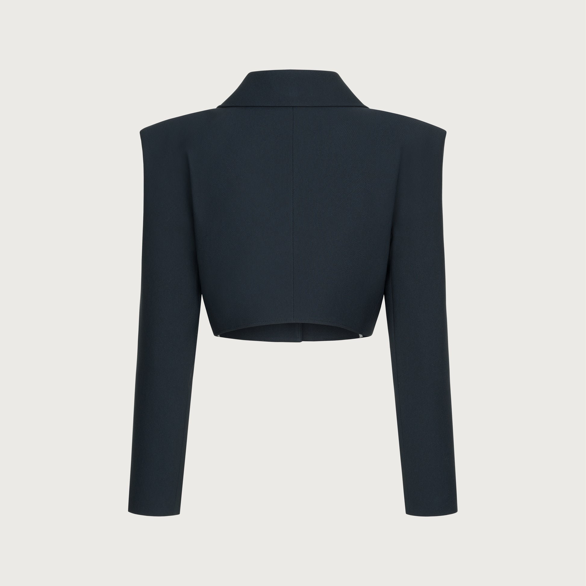 Crop Jacket with enlarged shoulders. The back of the design features a one-piece sleeve and back detail without a shoulder seam. Has two pockets, sleeves slots, hidden buttom fastening.