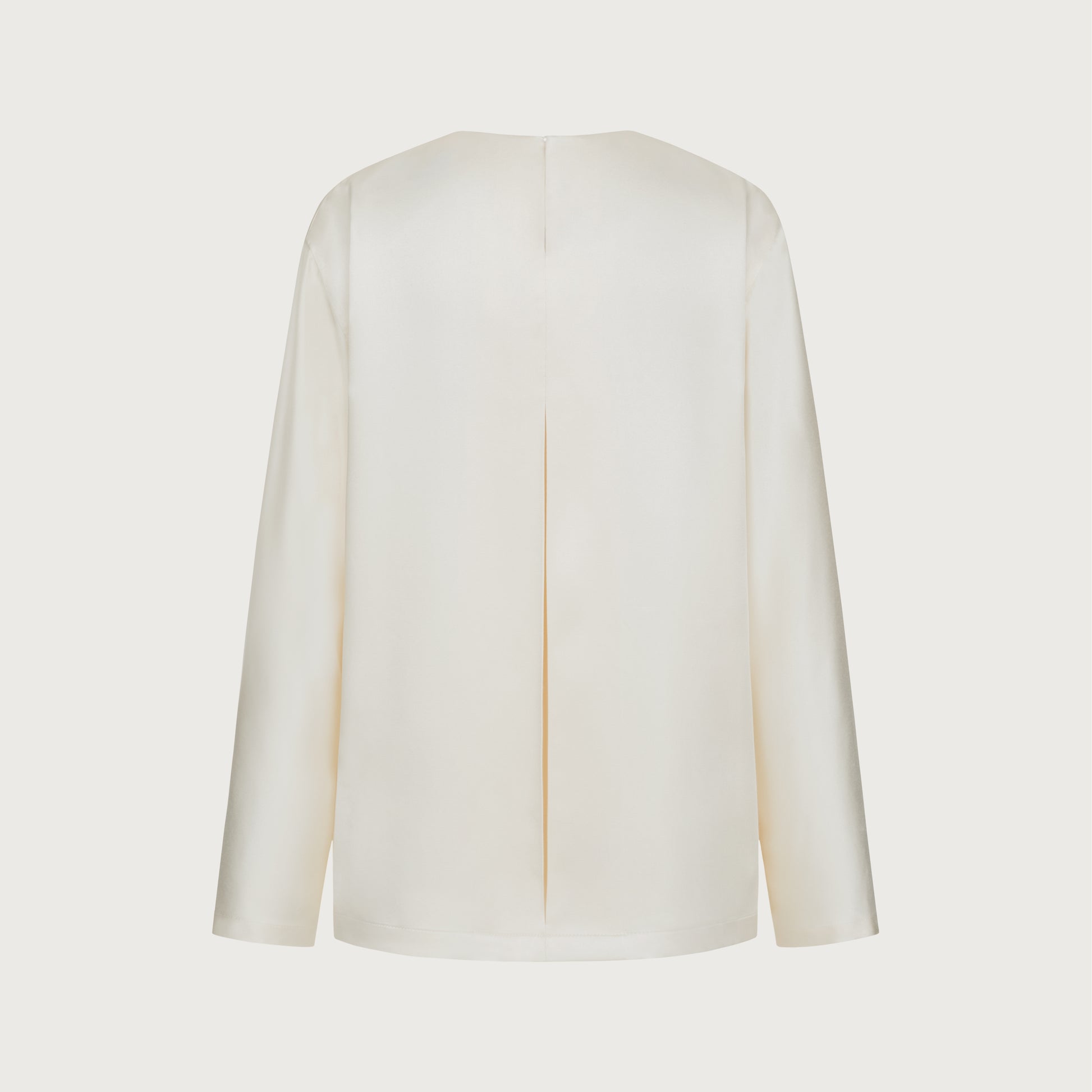 This top offers an oversized fit with a raised neckline, inverted pleat on the back, and the sleeves are narrower at the wrist. It fastens with a zip at the back of the neck.
